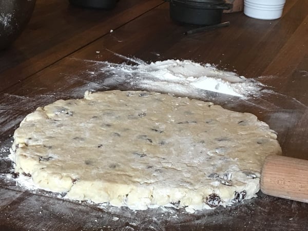- Using a biscuit cutter, cut scones and place on a baking pan lined with parchment paper or aluminum foil. Brush the tops of the scones with some of the heavy cream and then sprinkle with the sugar in the raw.