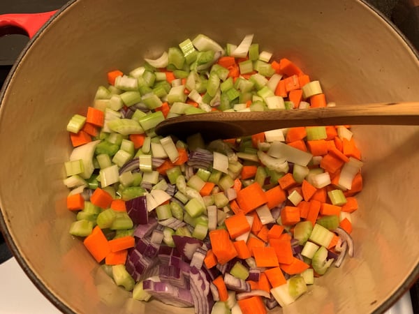 - Heat a large Dutch oven to medium heat and add the grapeseed oil. Once the pot is hot, add the diced vegetables and let them cook until glazed and aromatic.