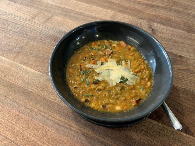 - Once the soup comes to a boil, reduce to a simmer and let it cook for about 45 minutes, until the beans are soft.