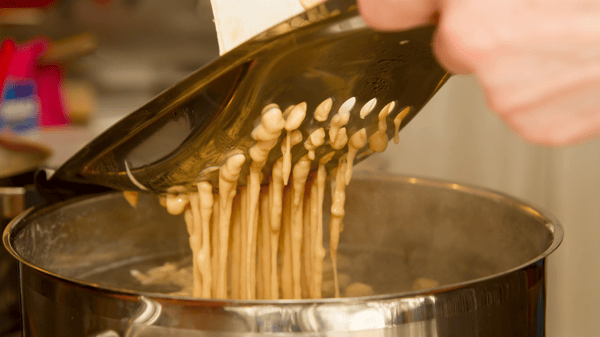 - Working in batches, pass the batter through a spätzle maker into the boiling water. Stir gently to prevent sticking. Boil until they float to the surface, then continue cooking for 1 additional minute.