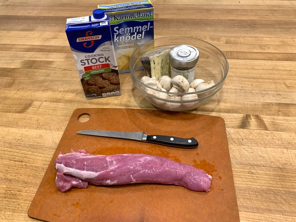 For this recipe, I utilize a pork tenderloin which is a tender part of the pork, so it does not need a lot of time to cook. The rest of the ingredients are mushrooms, a great Cambozola cheese, which is a cross between blue and brie cheese, super creamy and delicious to enhance the flavor of the sauce and the overall dish. Add some beef stock, or any kind of good stock to make a great sauce, and serve it with noodles such as homemade Spätzle or potato dumplings. Of course, adding mustard to the sauce will make all the difference!