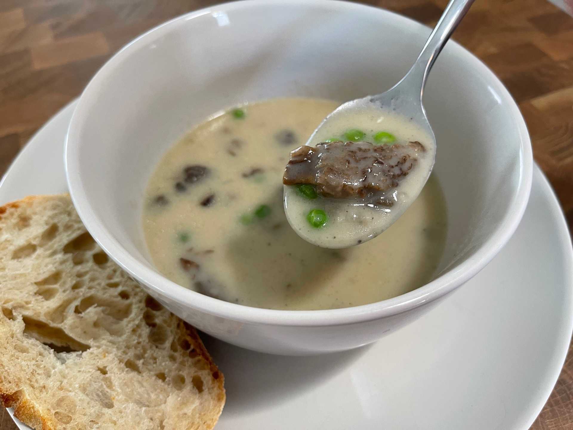 Add fresh peas and cream and simmer for an additional 10 minutes.