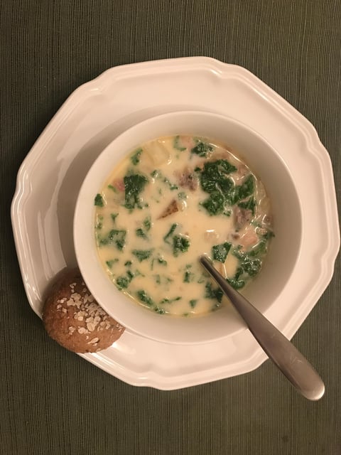 Let the soup cook on a low boil for about 20 minutes and then add the heavy whipping cream and the reserved sausage we sautéed earlier. Heat this through and then salt and pepper to taste. Right before serving, add the kale. Once it's nice and wilted you are ready to serve.