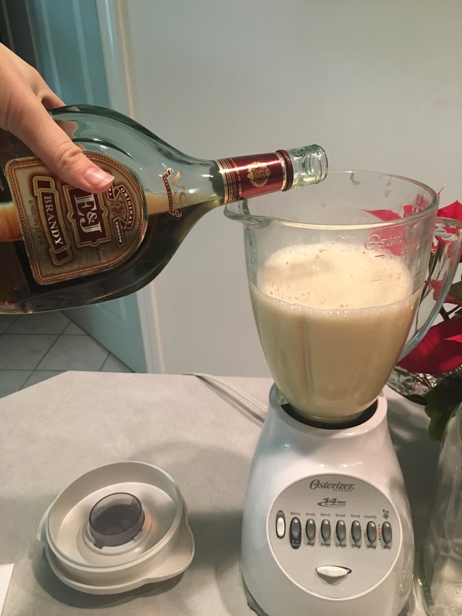 Next, add your liquor. My mother generally adds about 2/3 cup of Bacardi, sometimes more. Instead of blending your liquor, stir it inside the milk mixture. Transfer eggnog into a glass bottle, and store it in your fridge to sit overnight and thicken. Enjoy!