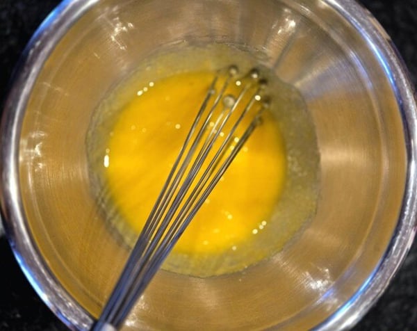 3. While the cream is heating, whisk the egg yolks, sugar and salt together in a large mixing bowl until combined. Slowly pour the warm cream into the egg/sugar mixture while gently whisking.