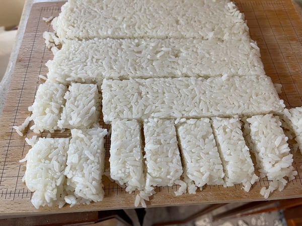 Line an 8 x 8 dish (cake pan) with plastic wrap. Place your sushi rice in and pat it down with hands coated in a little oil. (That will help you keep it from sticking to you.)