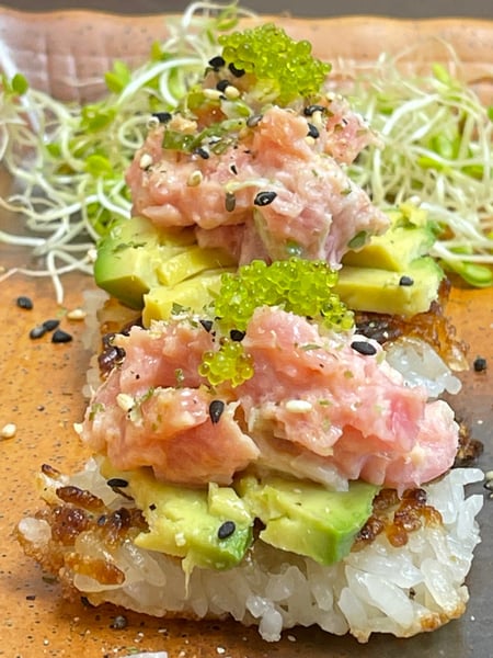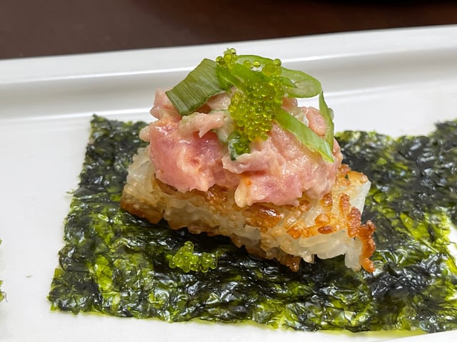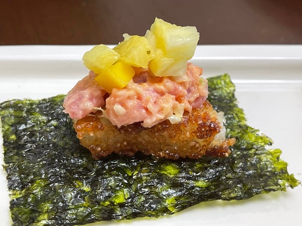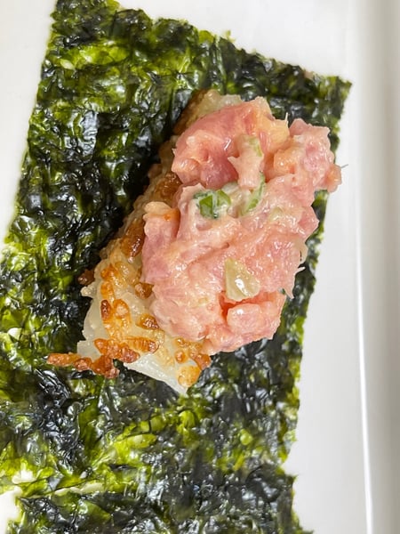 - Line plates with squares of nori like the snack size pieces that are found in most markets these days and placed the squares of crispy rice on top. Top with about 1 tablespoon of spicy tuna.