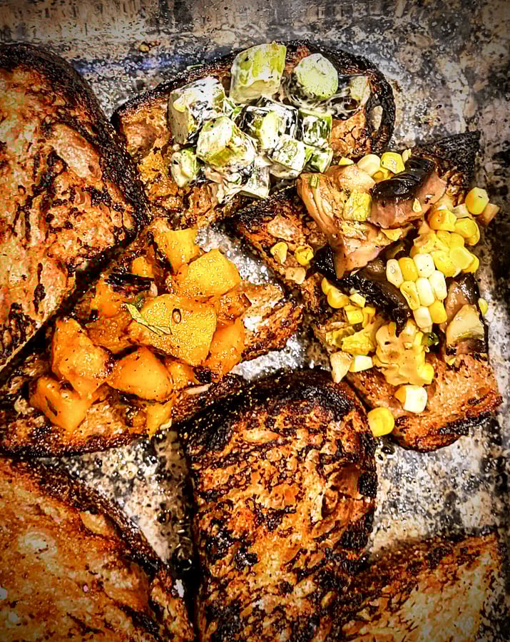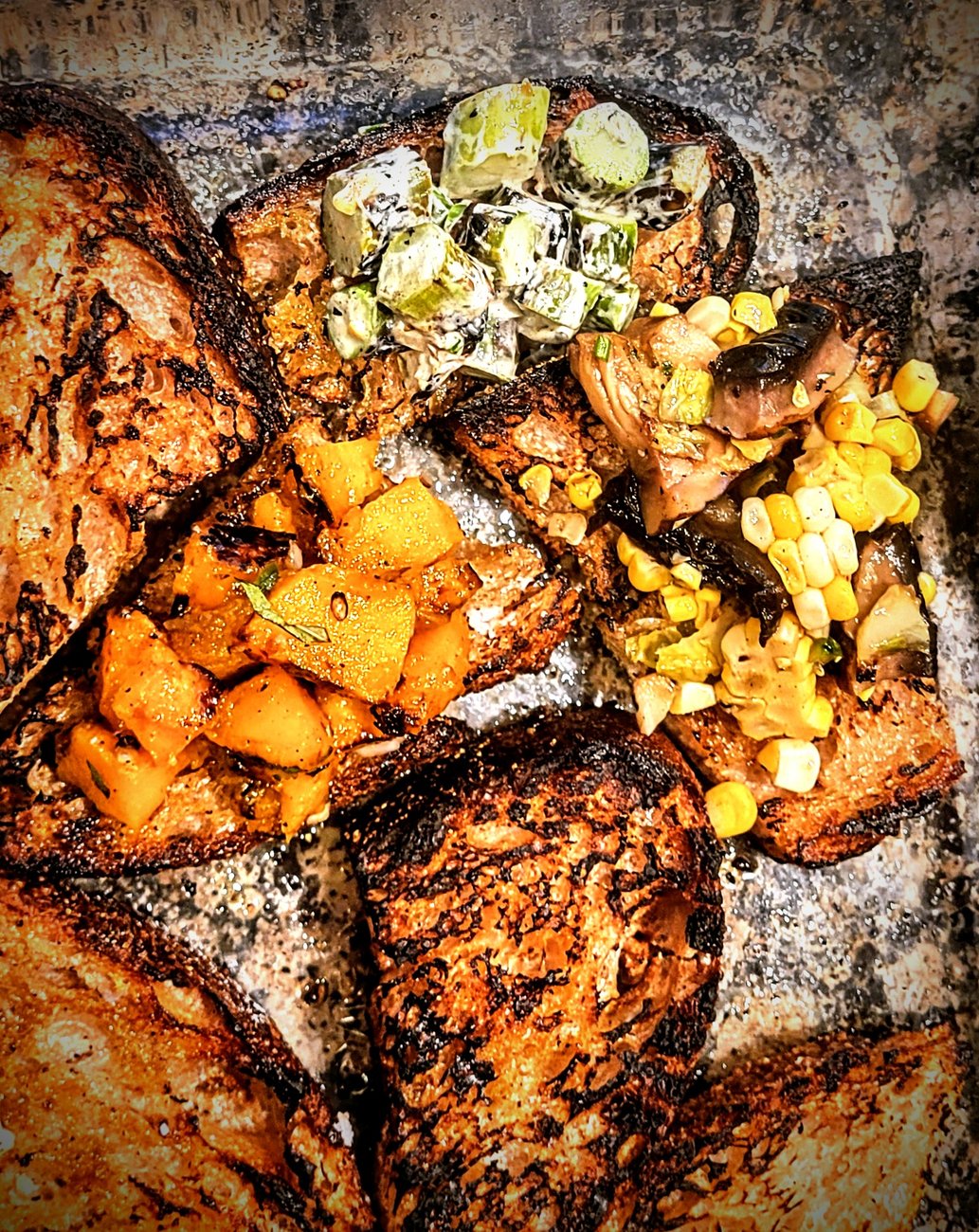 By this time the coals were in good shape. Most of this grilling fare would get done over a high heat. This includes the crostini, which I’ll reiterate are labeled as ‘charred’ and shouldn’t be treated with kid gloves. This is a hearty, rustic treatment. The squash would need to finish on low heat to cook thoroughly through its dense structure and sweeten its starches.