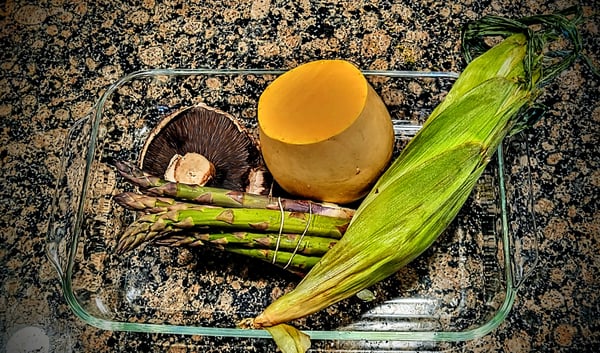 In addition to the asparagus, I collected a few odds and ends to add to the mix: the bell of a butternut squash, a couple of portabella mushrooms, an ear of corn. It’ll all get grilled up, and we’ll bring it to the kitchen to see how the pieces align.