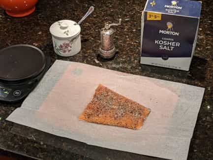 This recipe is measured in weight. I will not be providing volumetric measurements because they are not precise enough to produce a consistent product. I’m making a small amount here, but this recipe will work for an entire side of salmon