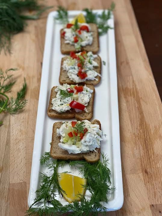 - Make a little assembly line. Toast, crab mix, fennel topping and dill garnish.