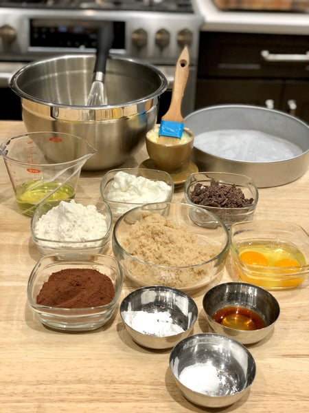 2. In a large bowl, whisk the brown sugar and eggs until pale and foamy, about 1 minute. Add yogurt, oil, vanilla, and salt. Whisk until smooth and emulsified, about 1 minute. Add the cocoa powder and whisk until well-combined, smooth and glossy.