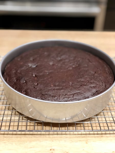 - After removing the cake from the oven, place the cake on a wire cooling rack to cool for 15 minutes. Gently run a paring knife around the edges of the cake, place the wire rack on the top of the cake and invert onto the cooling rack. Remove the parchment paper and invert the cake right side up once again onto your serving platter in order to cool. (I chose not to invert the cake a second time, I really enjoyed the look of it as it was after removing the parchment round) Let the cake cool completely at least two hours.