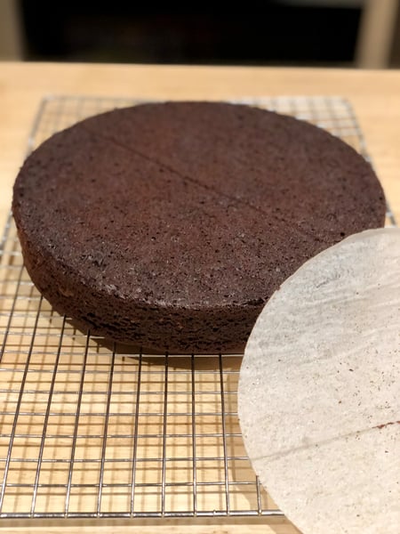 6. After removing the cake from the oven, place the cake on a wire cooling rack to cool for 15 minutes. Gently run a paring knife around the edges of the cake, place the wire rack on the top of the cake and invert onto the cooling rack. Remove the parchment paper and invert the cake right side up once again onto your serving platter in order to cool. (I chose not to invert the cake a second time, I really enjoyed the look of it as it was after removing the parchment round) Let the cake cool completely at least two hours.