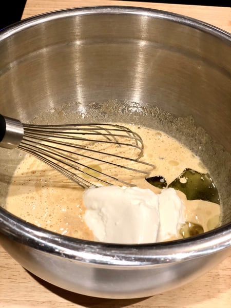 - In a large bowl, whisk the brown sugar and eggs until pale and foamy, about 1 minute. Add yogurt, oil, vanilla, and salt. Whisk until smooth and emulsified, about 1 minute. Add the cocoa powder and whisk until well-combined, smooth and glossy.