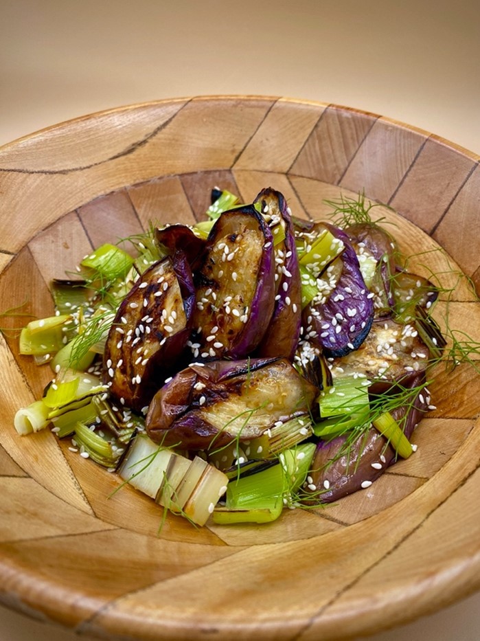 Slice the grilled leaks into 1/2-inch sections and toss with grilled eggplant. Dress the vegetables with as much sauce as desired and garnish with white sesame seeds.