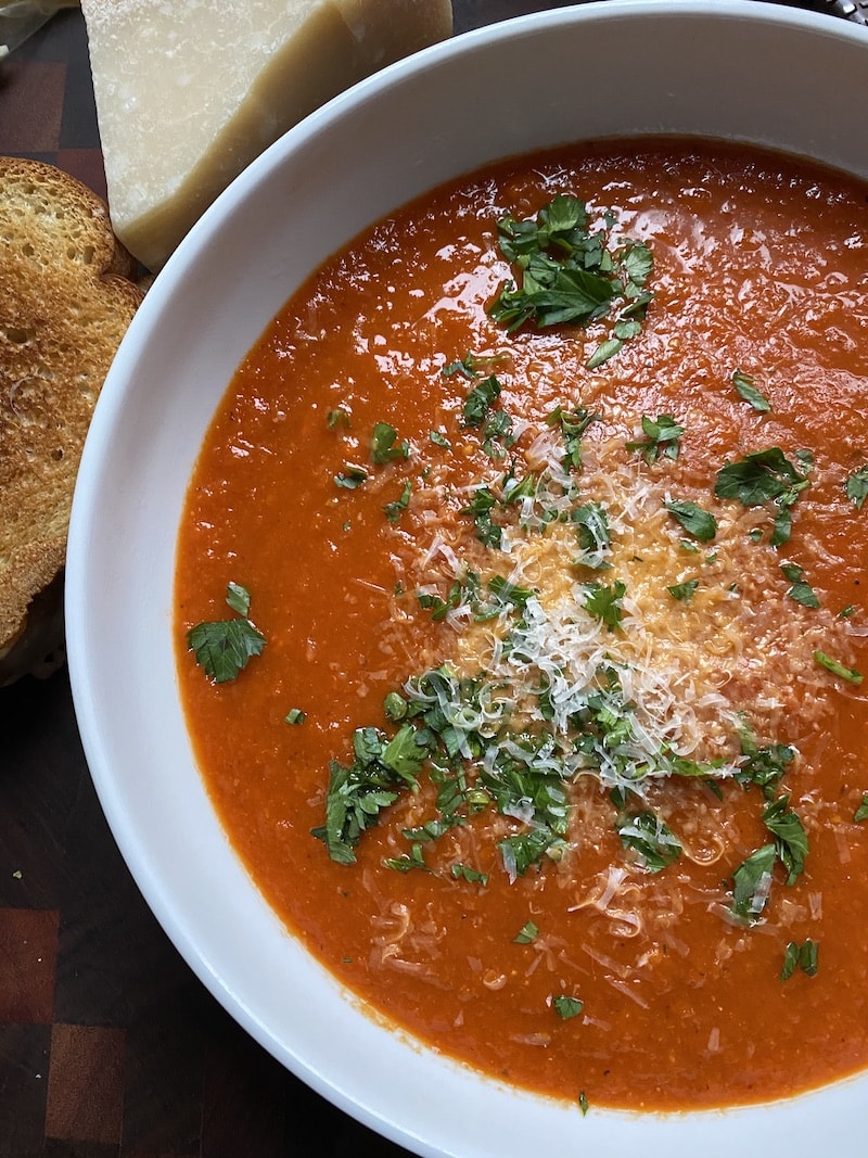 One of my go-to recipes this past year for a light lunch or afternoon snack, is this simple tomato soup. The secret to this quick and easy tomato soup is that I use jarred tomato sauce – and no one will ever know.