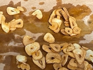 - Lower the heat, the thin garlic is going to go from light tan to dark brown fast. Your goal is for the lighter brown.