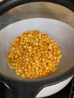 If there is any water left in them, they pop aggressively at you and scare the dog. Drain off oil and set aside.