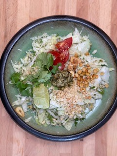 - Place about 1 cup of the cabbage in each bowl, if you are making 4 servings as a meal. (Use 1/2 cup of the cabbage if making side salads.)