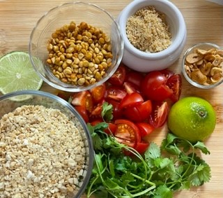 - Decoratively place the chopped tomatoes, fried garlic, peanuts, fried split peas (or fried chickpeas) and sesame seeds.