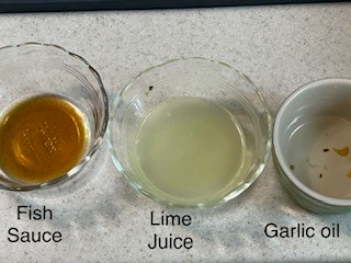 - In a small container, whisk together lime juice and fish sauce. Whisk in the garlic oil slowly. This will be a temporary emulsion so you may have to mix it again before serving.