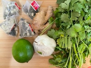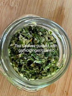 - In a small food processor finely chop the tea leaves with salt, garlic, ginger, lime juice and cilantro. (Exact measurements will be in recipe post below.)