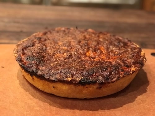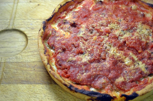 This is hands down the best deep dish pizza recipe I’ve made at home. The crust is buttery, and you don’t need any special equipment other than a cake pan. It's now one of my favorite pizza recipes!