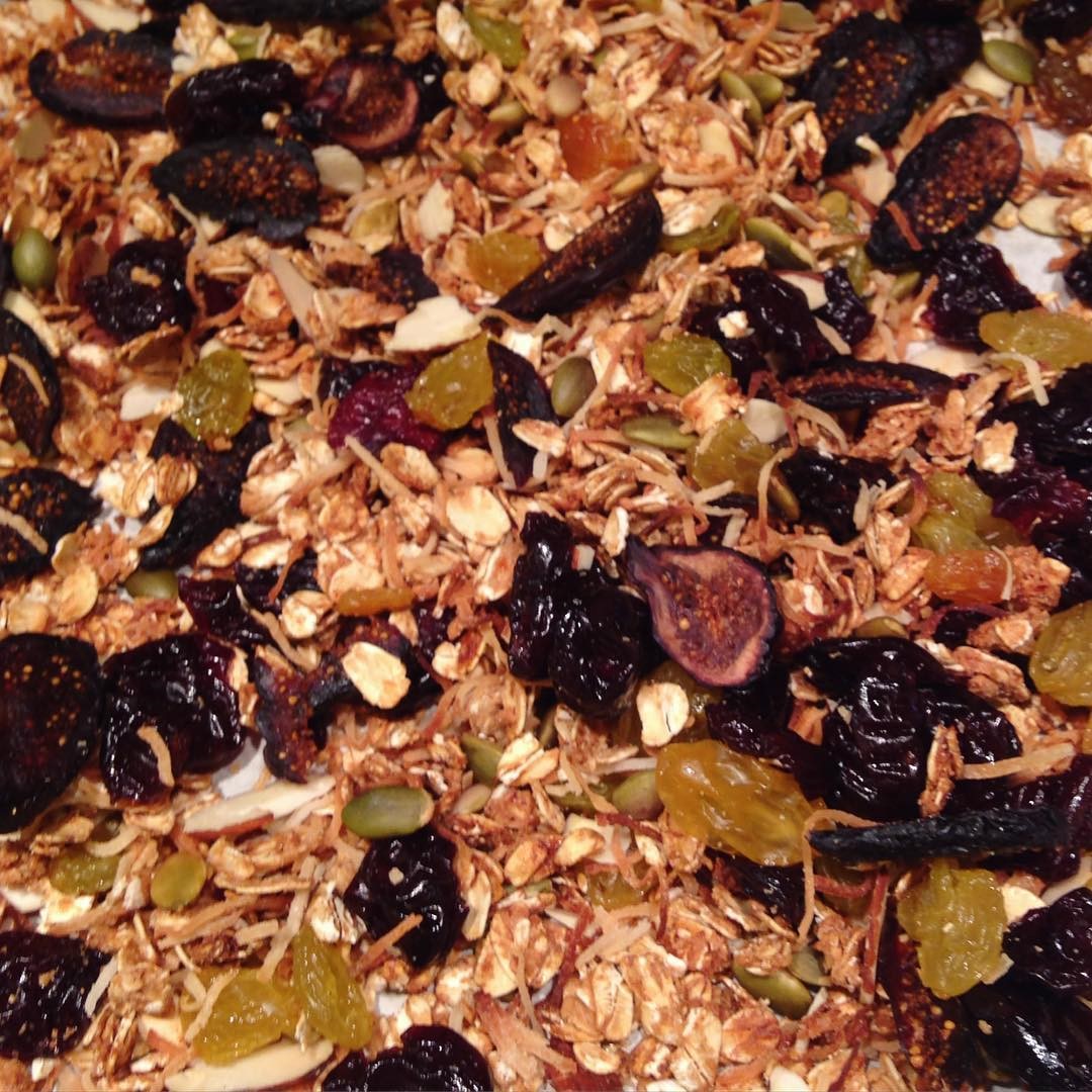 Walk through the bulk section of your grocery store and almost anything that you see in front of you makes for a crunchy, chewy and complex granola. Most of these ingredients should be introduced in the last 5-10 minutes of baking, especially if they are already toasted. Chocolate chips or anything else that can melt can be folded in once the mixture is already cooled.