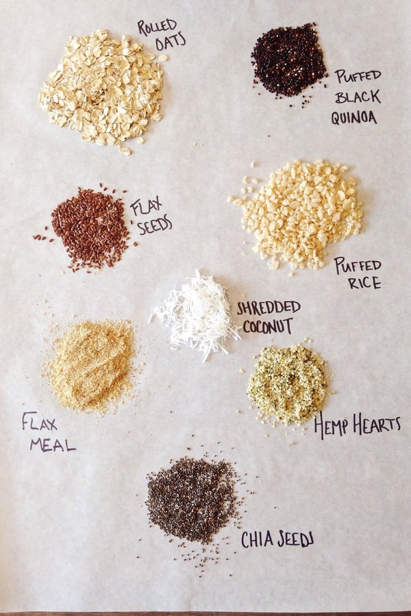 Start with your oats in a bowl. Add enough of any of these sweeteners to make your oats coated in a thin layer. A little canola oil will help your oats toast up nicely. Spread your oats or any other raw base ingredients onto a parchment or Silpat lined sheet tray and let toast for about 10 minutes at 375F until fragrant and slightly toasty. Any ingredient that you’re adding that is already toasted or dehydrated will be added in the last few minutes to ensure that you don’t over bake.