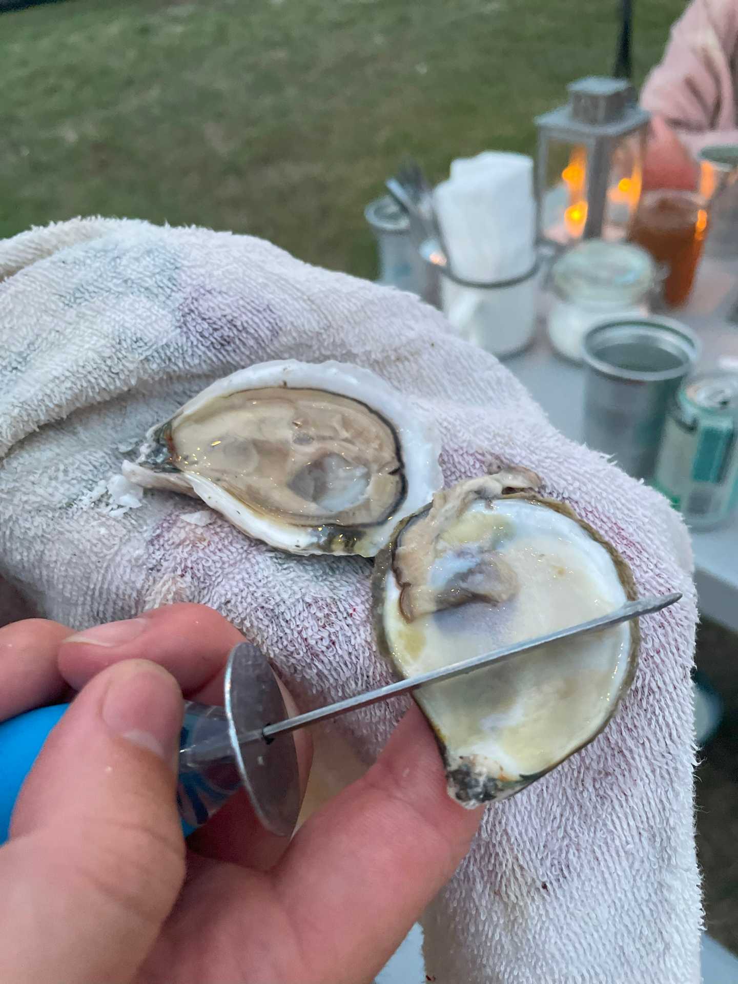 The last step is to use the tip of the knife and push sideways through the abductor muscle, this releases the oyster so it slides off the shell when you go to eat it.