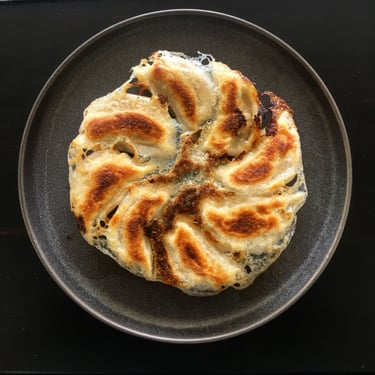 Place the pan on medium-high heat and cover with a lid. Cook the dumplings until all of the water evaporates (all that steam cooks the filling and wrappers) and then continue cooking, with the lid on, until the oil in the pan fries and crisps the bottoms. You’ll know you’re getting close when the noise from the pan sounds more sizzly; when you hear this transformation, remove the lid and check the bottoms. Once golden brown, transfer to a platter and serve with dipping sauce.