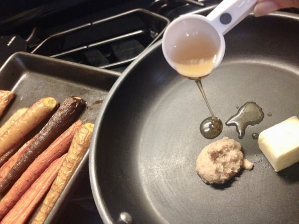 Maybe you are in a hurry – say, you just this minute realized you don’t have a vegetable for dinner tonight? Quickly cut standard carrots into coins and boil until tender. Drain and, in the same pan, toss them for a few minutes with these simple glaze ingredients. Twenty minutes and one pan. What could be easier?