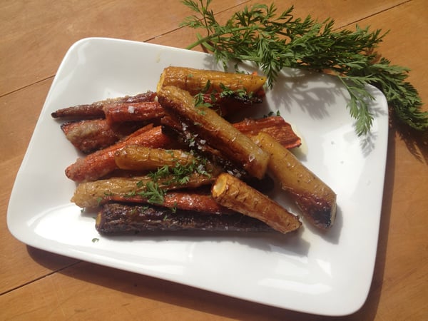 4. Sprinkle with a generous shower of coarse sea salt and garnish with chopped carrot tops if desired. Serve warm.
