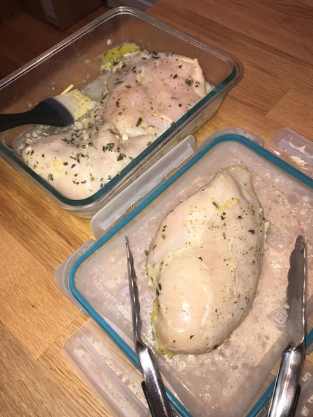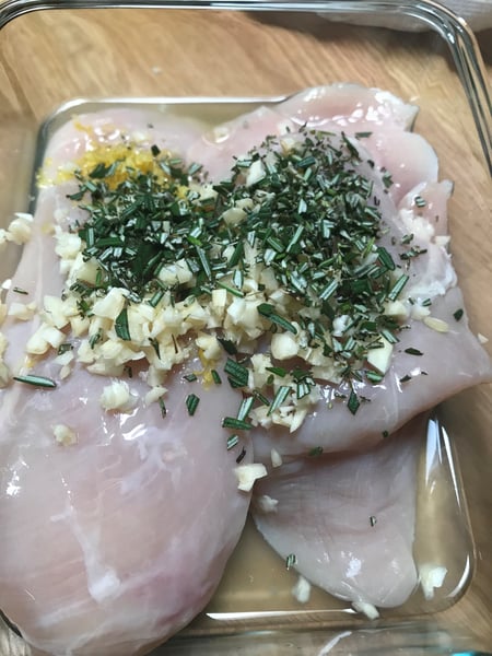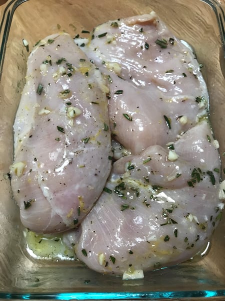 Combine chicken breasts with all the ingredients, and be sure to rub the chicken with some love to be sure it is well coated with all the ingredients.