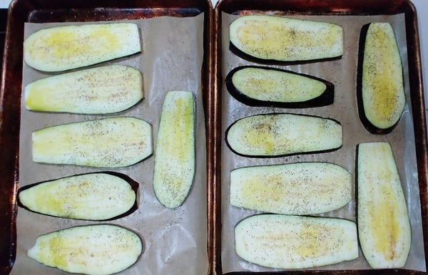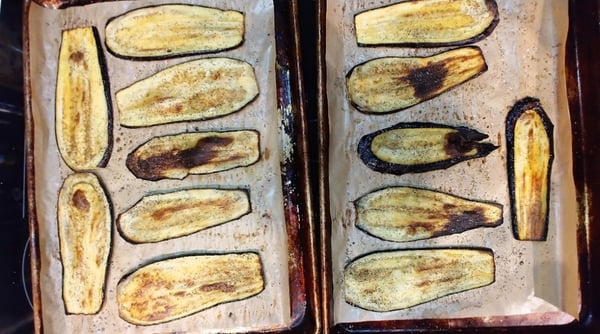10. Remove the sheet pans from the oven and let cool until you can handle the eggplant slices comfortably, about 5-10 minutes.