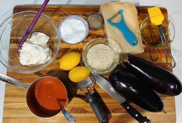 The second item that may be prepared ahead is slicing and baking the eggplant slices. You must let them cool a bit before you fill and roll them anyway, so why not make them earlier in the day, or even the day before? For this recipe, however, we’ll be preparing the eggplant as part of the recipe since I’ll be walking you through the process. Total time for making these eggplant involtini is about one hour.