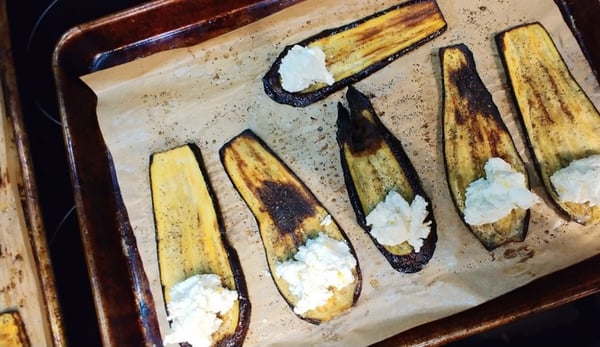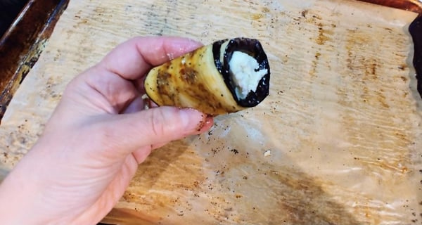 - Place about 2 teaspoons of filling at the widest end of the eggplant slices. You may use a bit more or a bit less, depending on the size of the slice – and depending on how much filling you personally prefer inside of each little bundle.