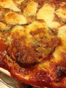 - While waiting for the eggplant slices to cool, ladle about 3/4 cup of marinara sauce into the bottom of a 9”-10” round baking dish. You only need enough to cover the bottom of the dish. Keep the remaining sauce warm.