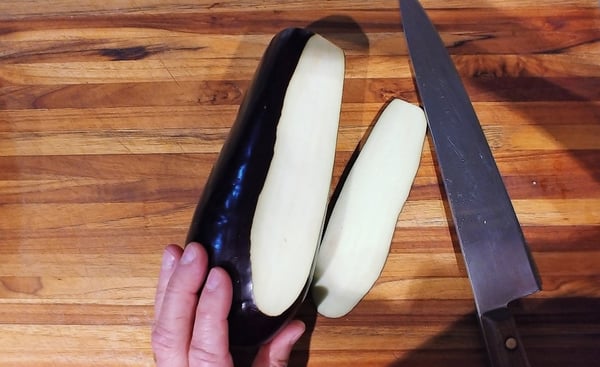 3. Slice about 1/8” off one side of each eggplant. This is intended to avoid a slice of eggplant with “skin only” on one side. I like to keep these small slices aside to use for something else. For example, roasting them on their own for eggplant sandwiches or adding to salads is a real treat! Here’s a photo of the bit I sliced off; you can see that the slice does not even go all the way to the bottom of the eggplant.