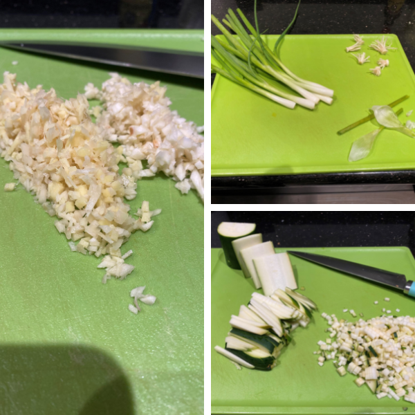 - Dice zucchini, ginger, garlic, and scallions and add to the large bowl.
