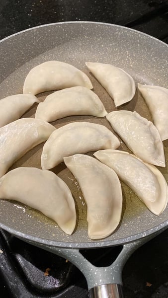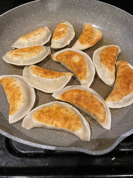 Another method of cooking the dumplings is in an air fryer. Brush or spray the dumplings lightly with oil and cook them in an air fryer for five minutes at 350 and then flip and repeat for another five minutes until crispy.