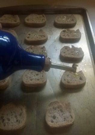 2. Drizzle the bread with olive oil. This is where have a cruet comes in handy; you get a lovely drizzle without drowning your slices in oil.