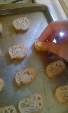 5. Once the bread is out of the oven, cut the clove of garlic in half and rub the cut end on the warm bread. This will leave the bread nice and garlic-y. The more you rub, the stronger the flavor.