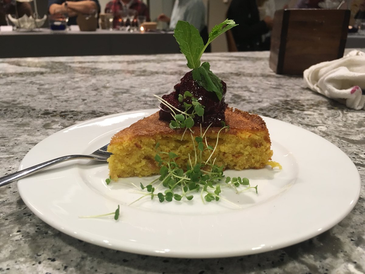 The meal started off with some stuffed griddle breads, which I had a hand in prepping ahead of time. These breads were rolled out thin, stuffed with a delicious tuber and scallion filling and then rolled out again. These, along with some scratch-made sourdough were served with an assortment of pickles and relishes, made from smoked almonds and beets, for example.