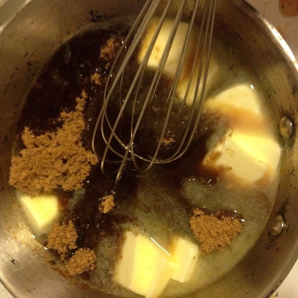 2. Once you have about ½ cup of apple cider, add in one stick of butter and a cup of brown sugar and whisk.