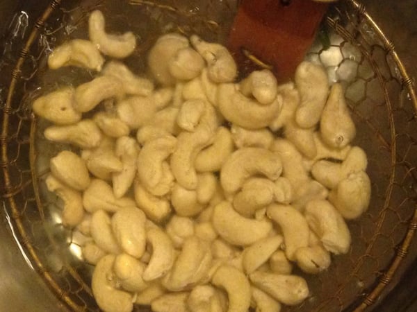1. Blanch one cup of raw, unsalted cashews in boiling water for about a minute.