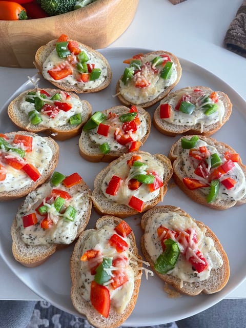 - Drop a tablespoon of mayonnaise mix on the bread slice, top with pepper pieces, and bake for 10-12 minutes or until lightly crisp.
