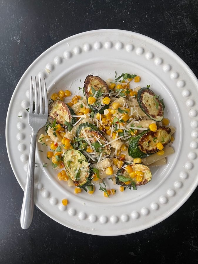 - Plate the zucchini and corn pasta, and garnish with a sprinkle of fresh herbs, such as basil or parsley, if desired.