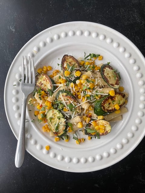 9. Serve and enjoy: Plate the zucchini and corn pasta, and garnish with a sprinkle of fresh herbs, such as basil or parsley, if desired. Dive into the refreshing combination of flavors and savor the essence of the farmers market produce in every bite.